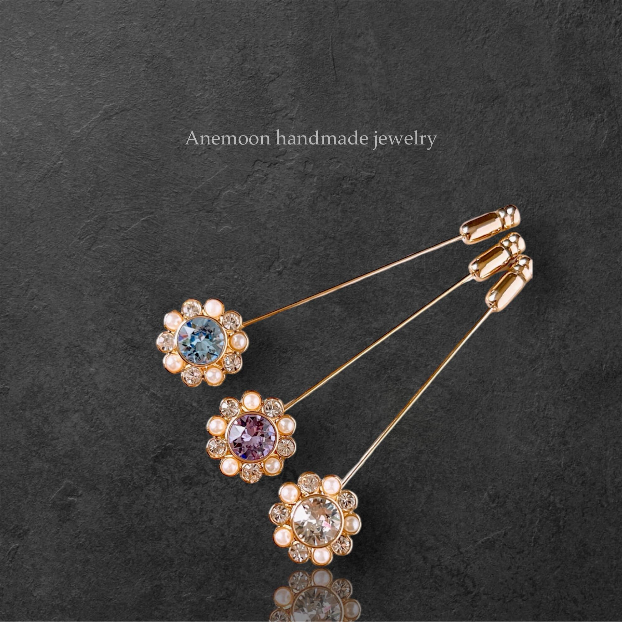 パール 紫 パープル 古希 ブルー 水色 青 キラキラ 花 フラワー 花見 春色 スワロフスキー キュービックジルコニア 飾り かざり 襟 胸 コート カーディガン マフラー ニット 帽子 ストールピン カブトピン コサージュピン ハットピン ラペルピン ワンポイント 春 夏 秋 冬 おでかけ 母の日 誕生日 記念日 クリスマス プレゼント ギフト お呼ばれ 結婚式 パーティー ハンドメイド アクセサリー アネムーン