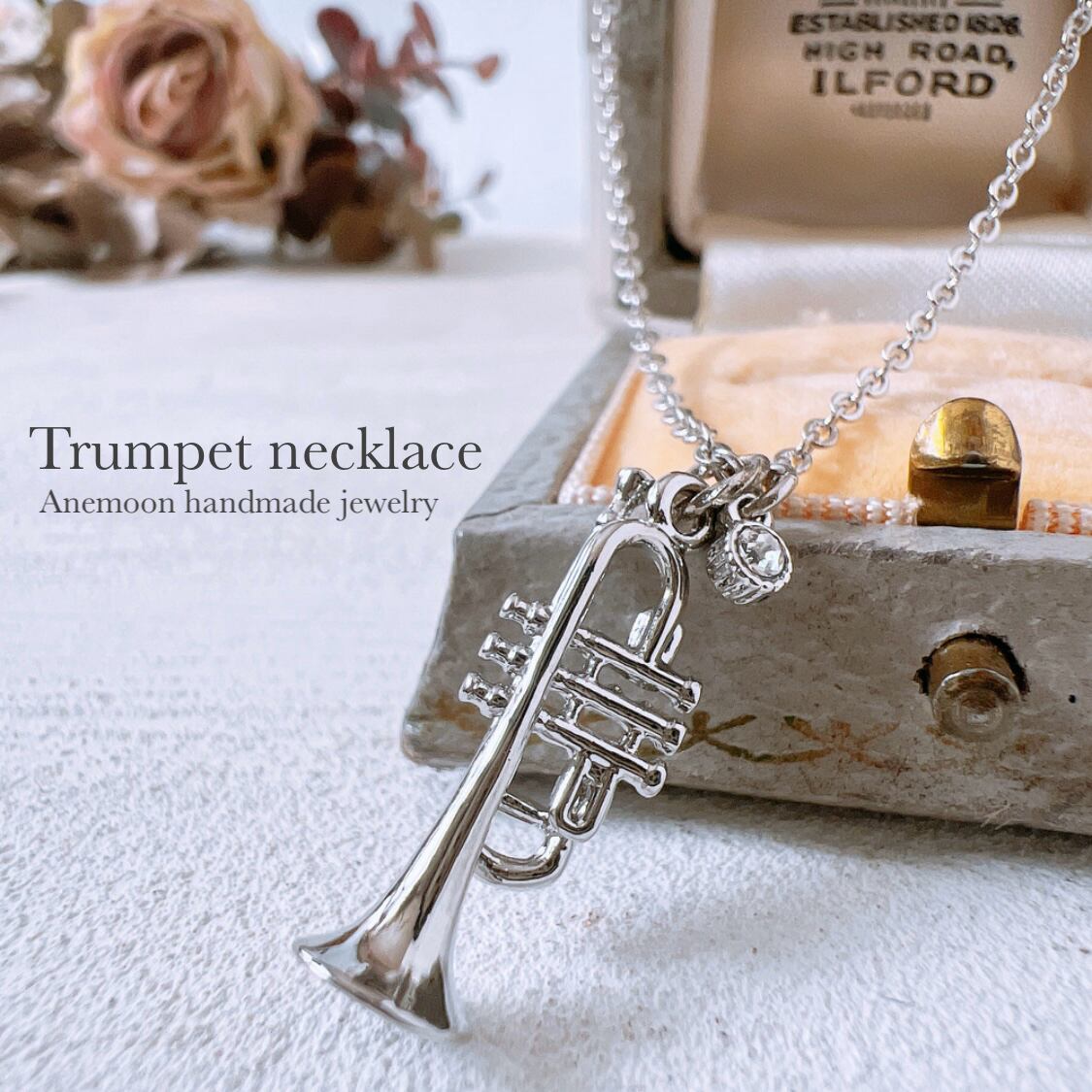小さく立体的なトランペットチャームが胸元で揺れる、音楽モチーフのネックレスです。