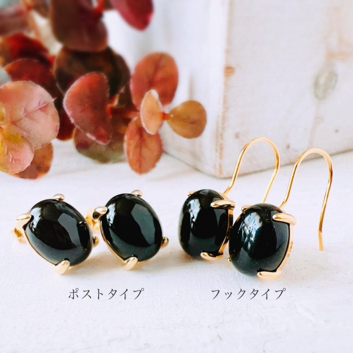ストーンは高品質で艶、かたち、色共に美しく、シンプルなオーバル型。サイズは小さすぎず大きすぎないほどよいサイズ感の10×8mmでぷっくり感もある厚みのあるブラックオニキスを使用しています。