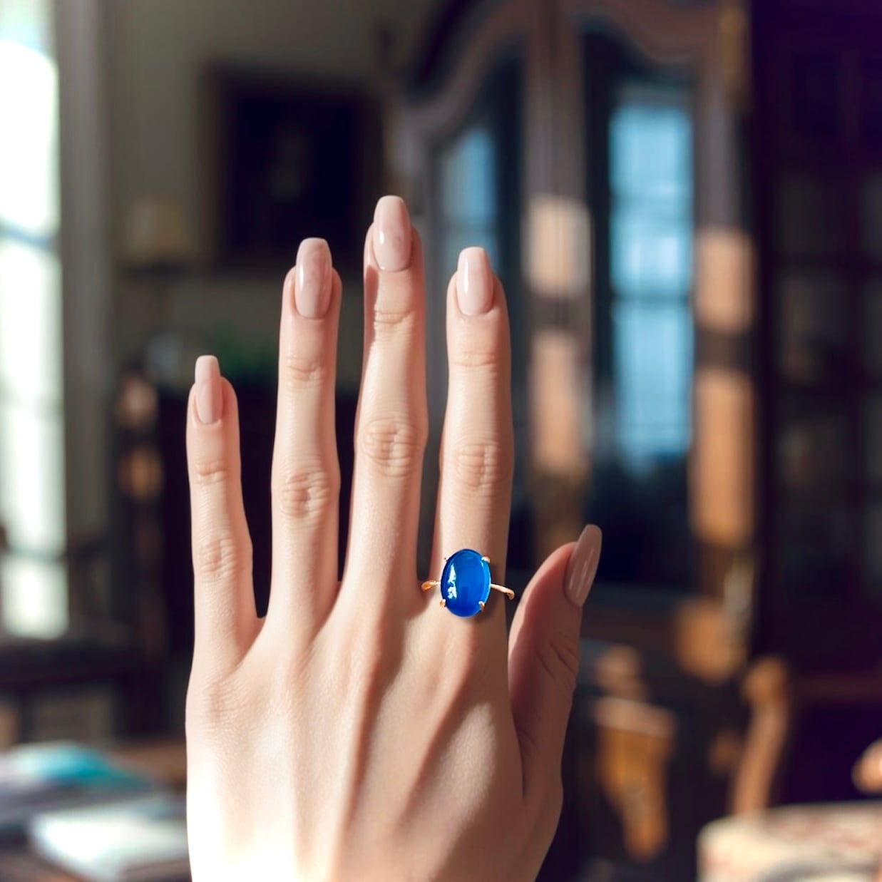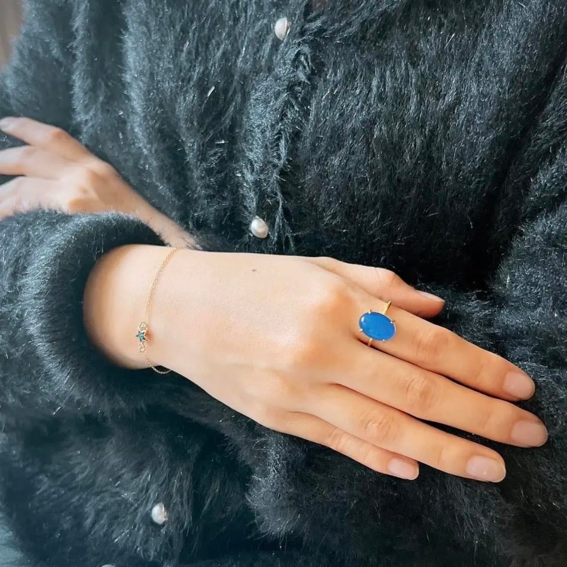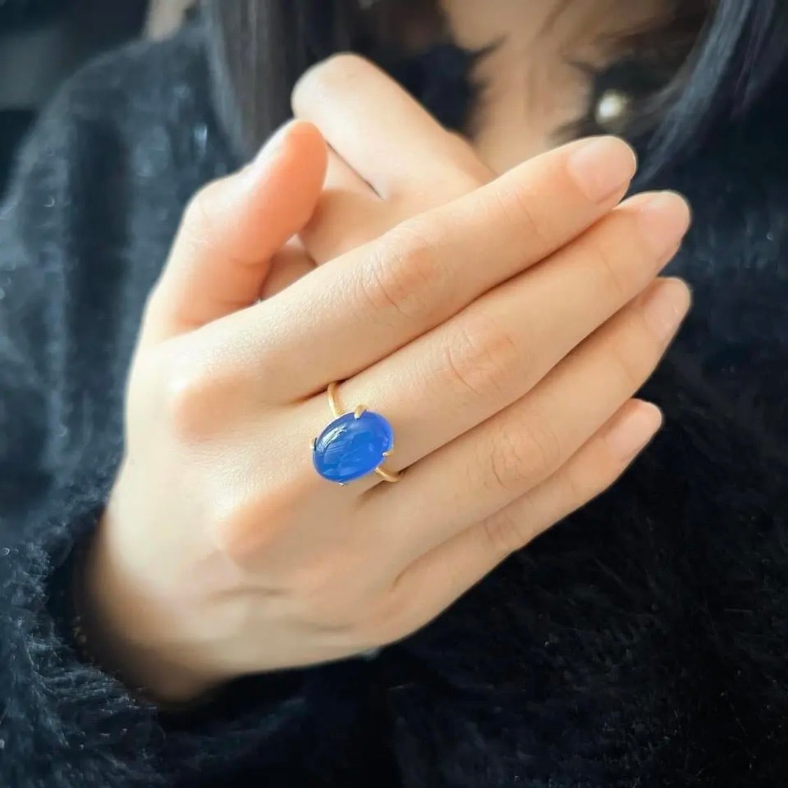 滑らかな光沢と深みのあるブルーが、指先に静かな存在感と品のある華やぎを添えます。
