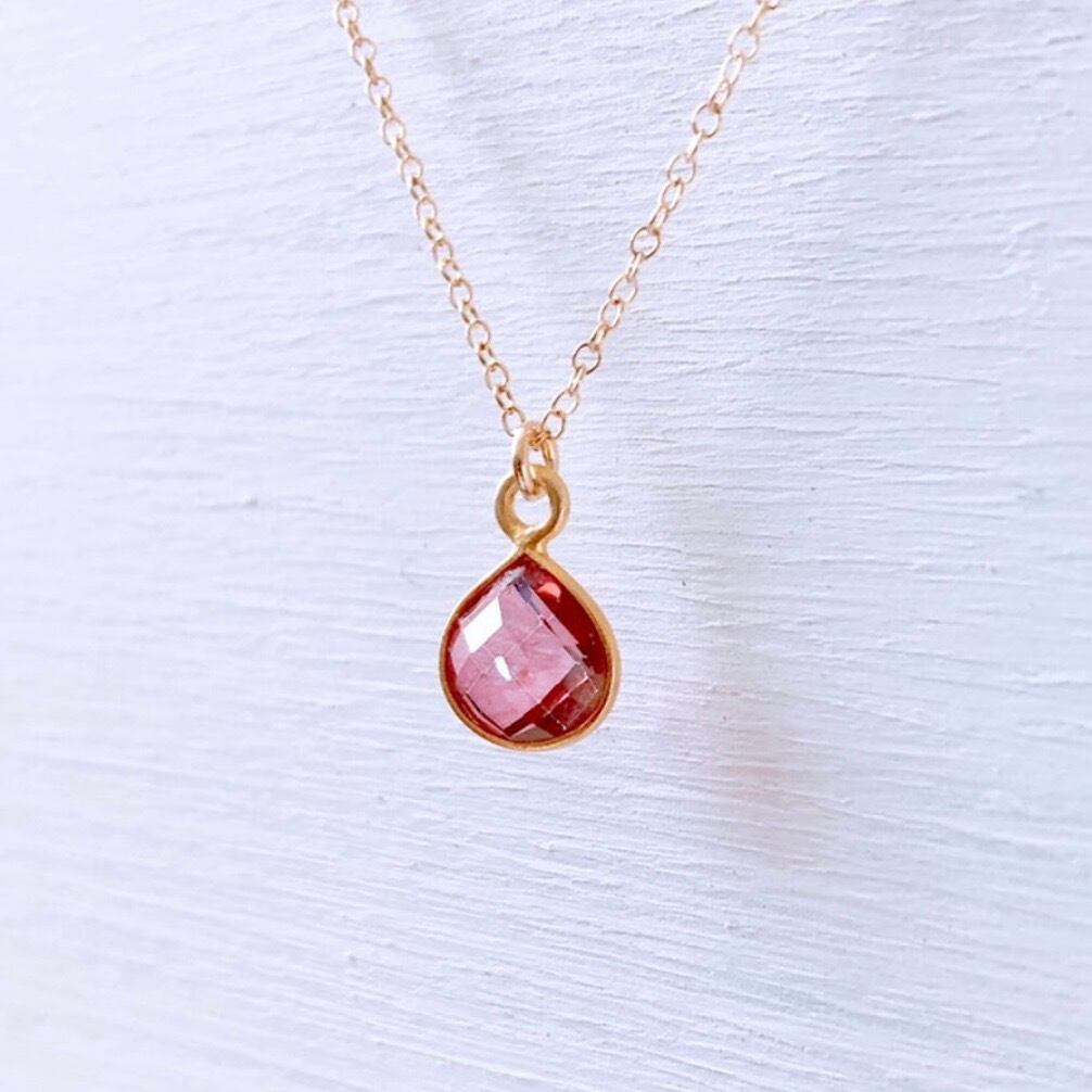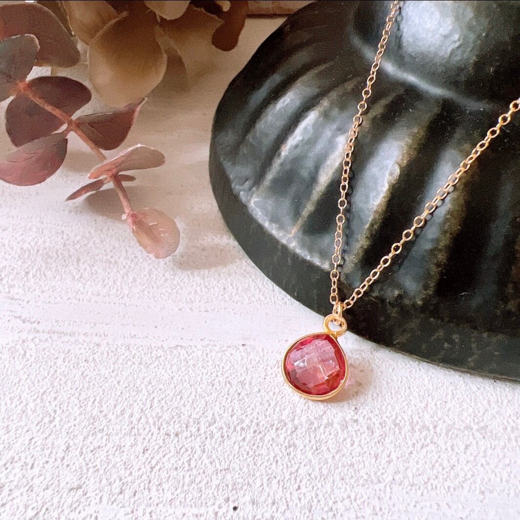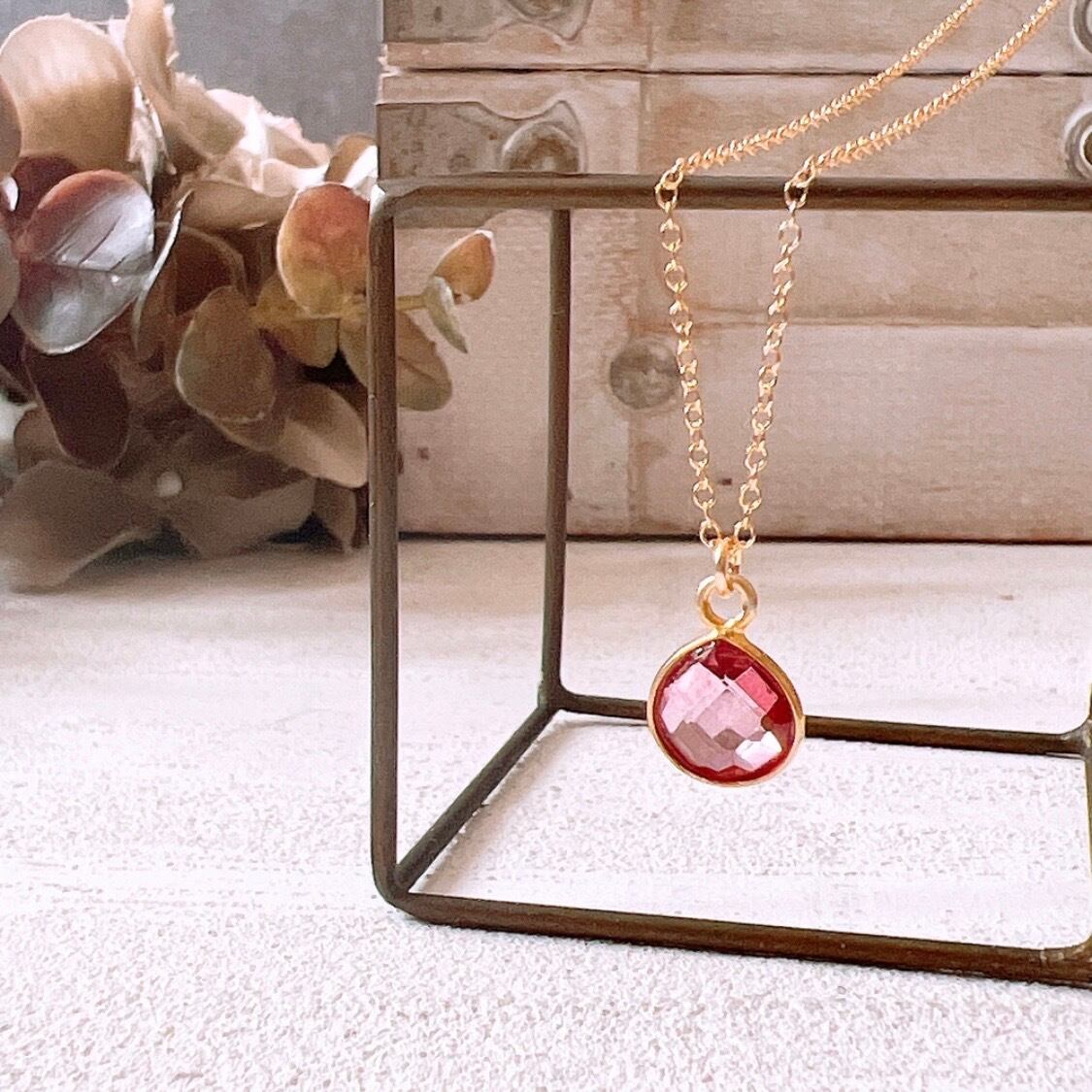 やわらかな赤みを帯びたピンクが印象的で、ストーンの両面には丁寧なカットが施され、動くたびに胸元で揺れ、繊細なきらめきを放ちます。