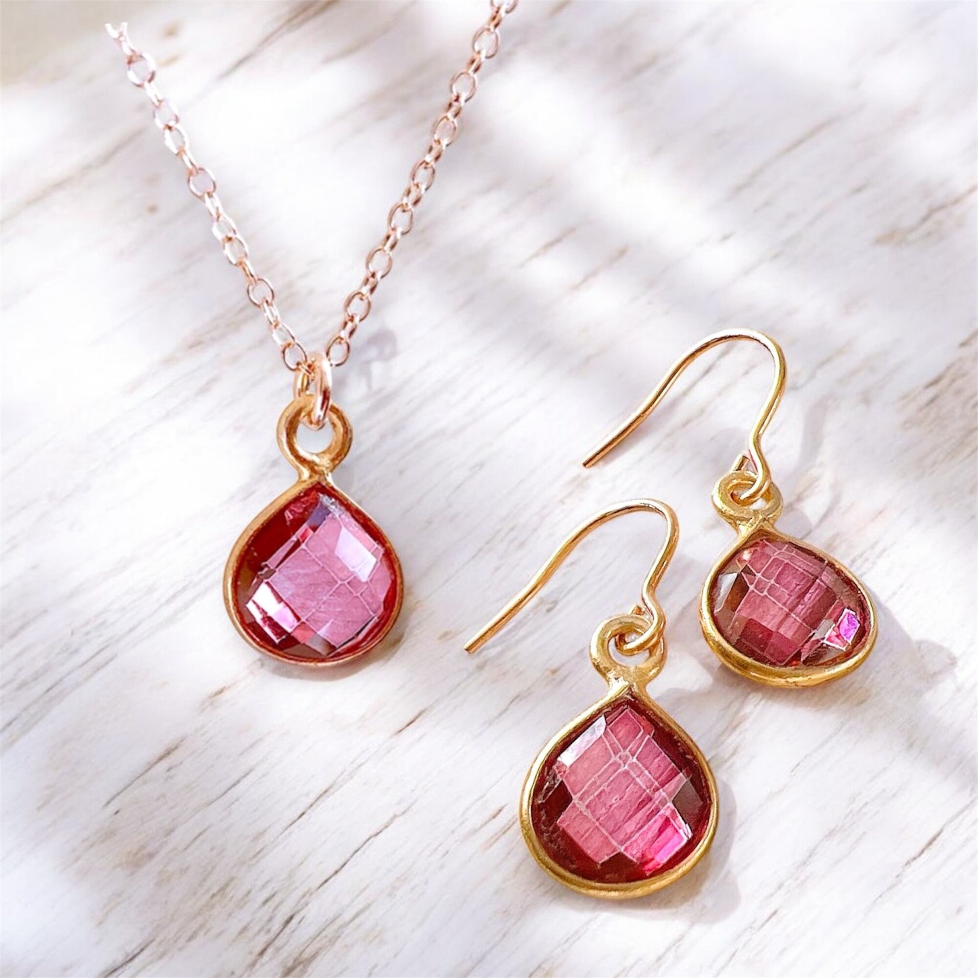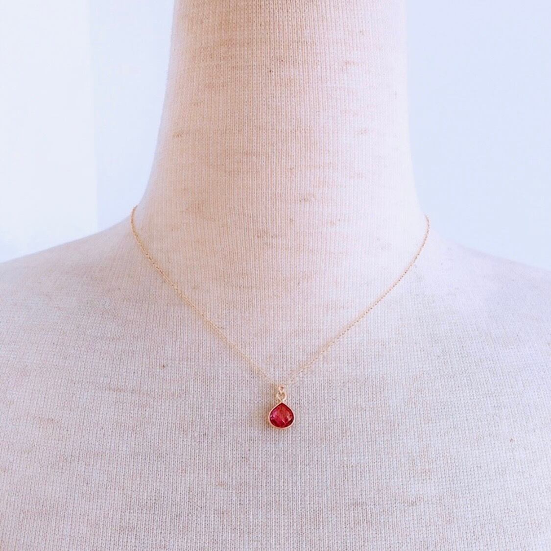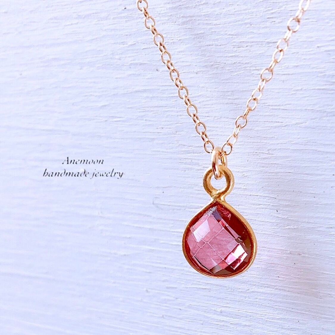 やわらかな赤みを帯びたピンクが印象的で、ストーンの両面には丁寧なカットが施され、動くたびに胸元で揺れ、繊細なきらめきを放ちます。