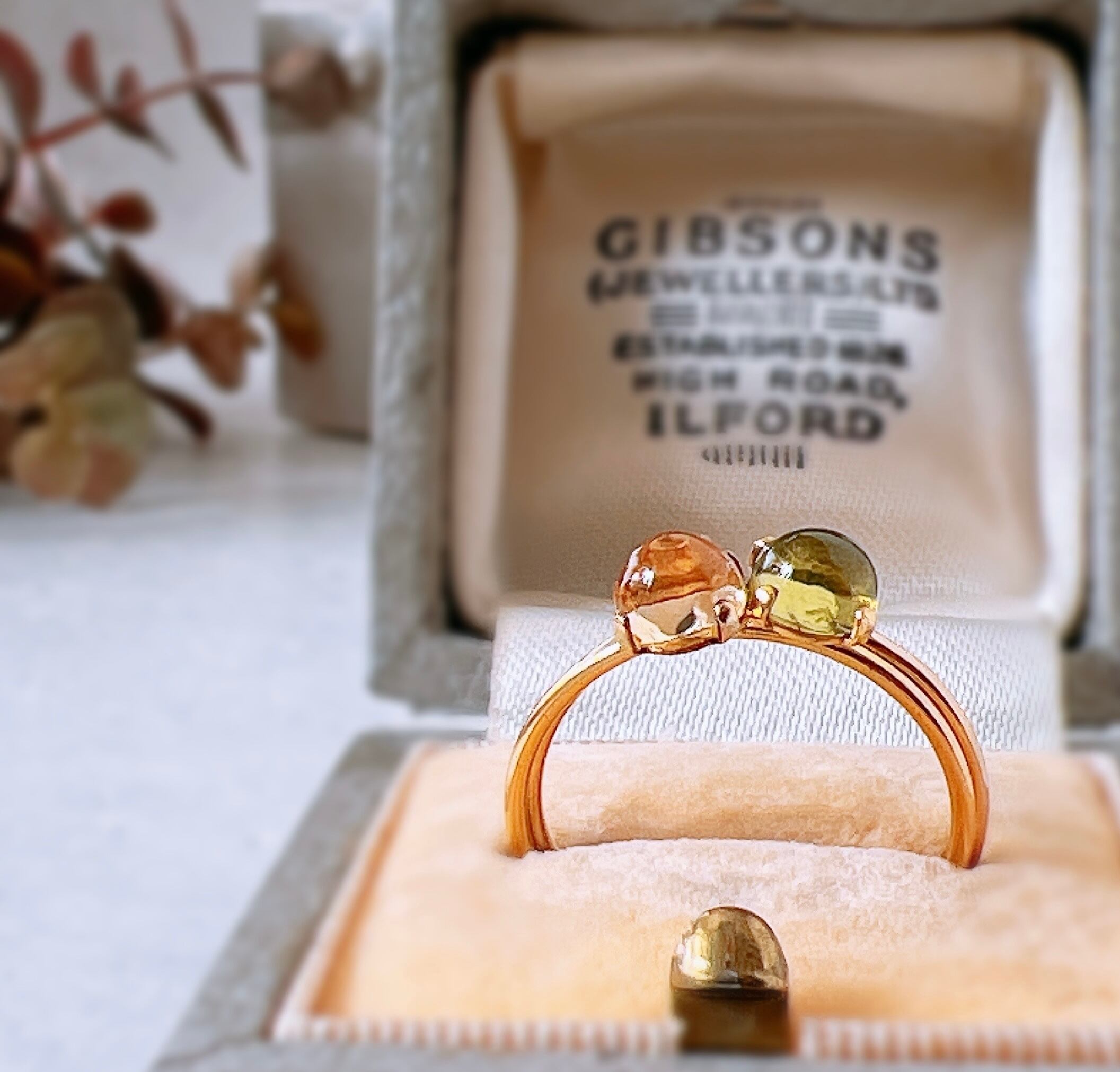 美しいオリーブグリーンの透き通るような半球の石が魅力的なペリドットの14kgfリング