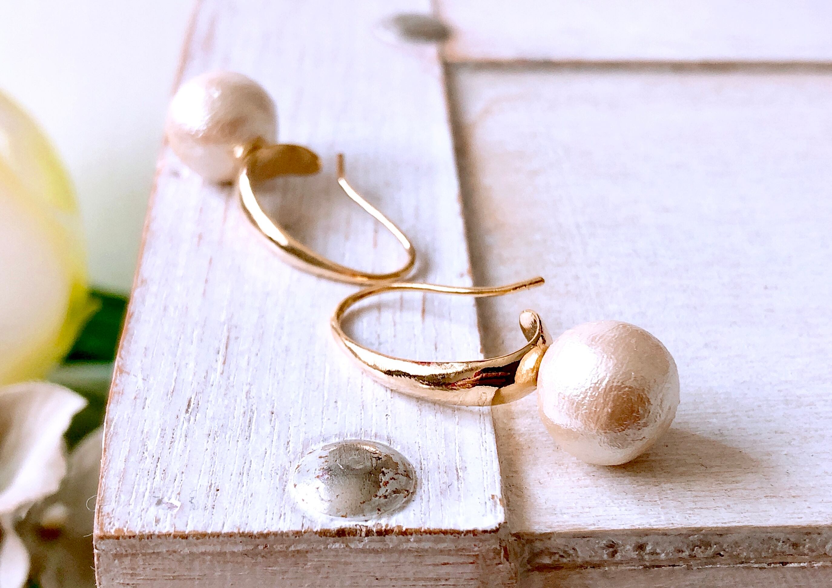 シンプルな美しいカーブのフックピアスにコットンパールをあわせた綺麗目ピアス